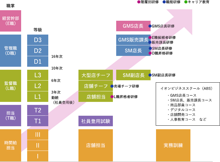 イオングループのコア人材を育成する「イオンビジネススクール(ABS)」をはじめ、各マネジメント職や商品部員への登用時に行う「新任研修」、昇格時に行う「登用研修」など、役割に応じて一人ひとりの成長をサポートする研修制度が充実しています。このほか、お客さま満足の追求のため、販売・技術のレベルアップを図る社内資格認定制度が16種類あり、ベビーアドバイザーやサイクルアドバイザー、農産マスターといった検定を行っております。