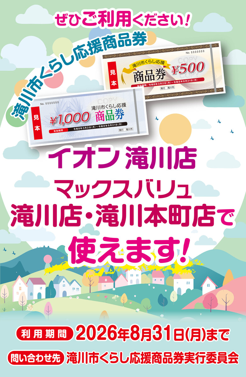 26.02.25 当店で滝川くらし応援商品券がご利用いただけます 当店では滝川くらし応援商品券がご利用いただけます。 📆ご利用期間2026年3月2日(月)~2026年8月31日(月) 皆さまのご来店をお待ちしております。